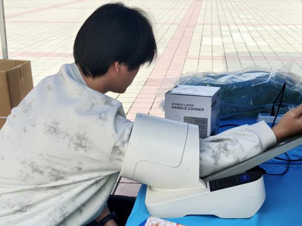 4月22日,菏泽学院在雅苑餐厅前组织了献血活动。化学化工学院学子积极响应并按时参与。