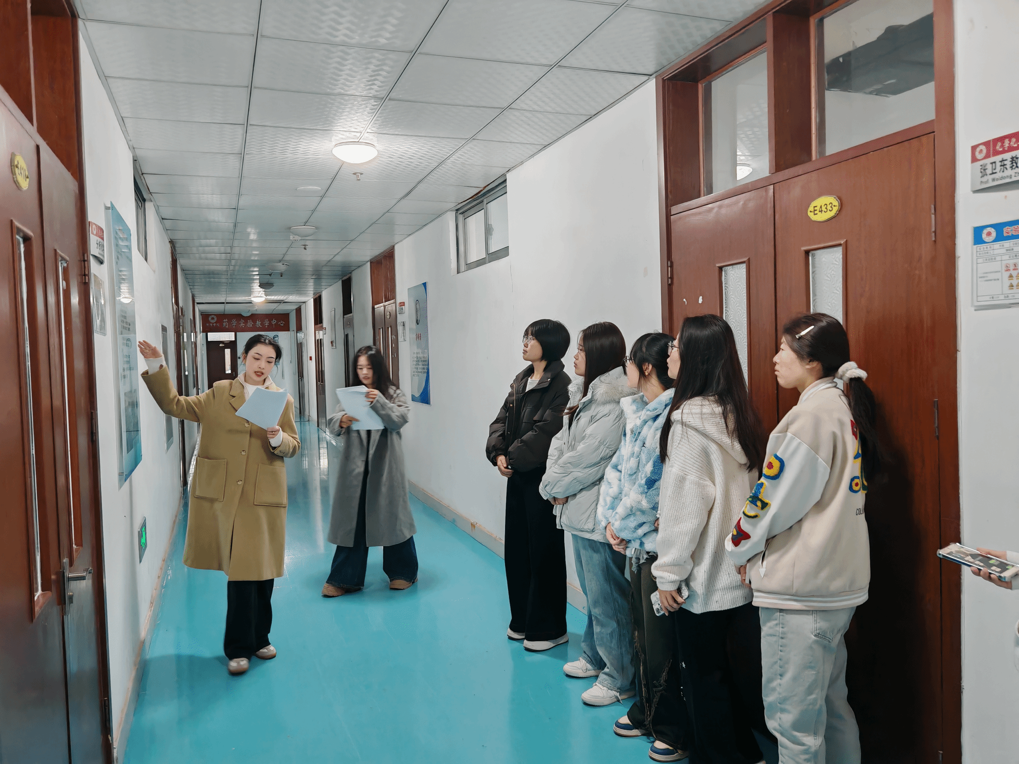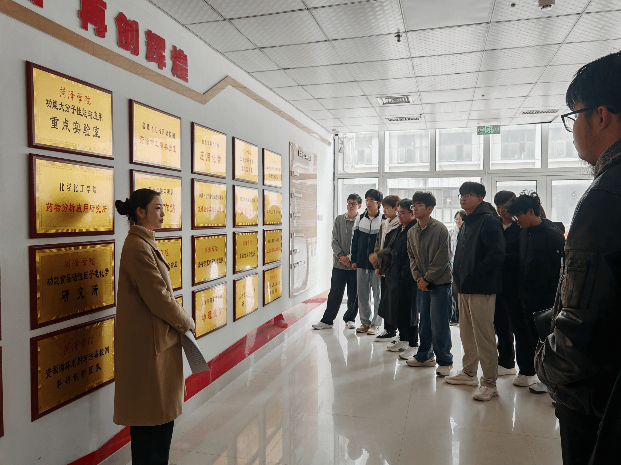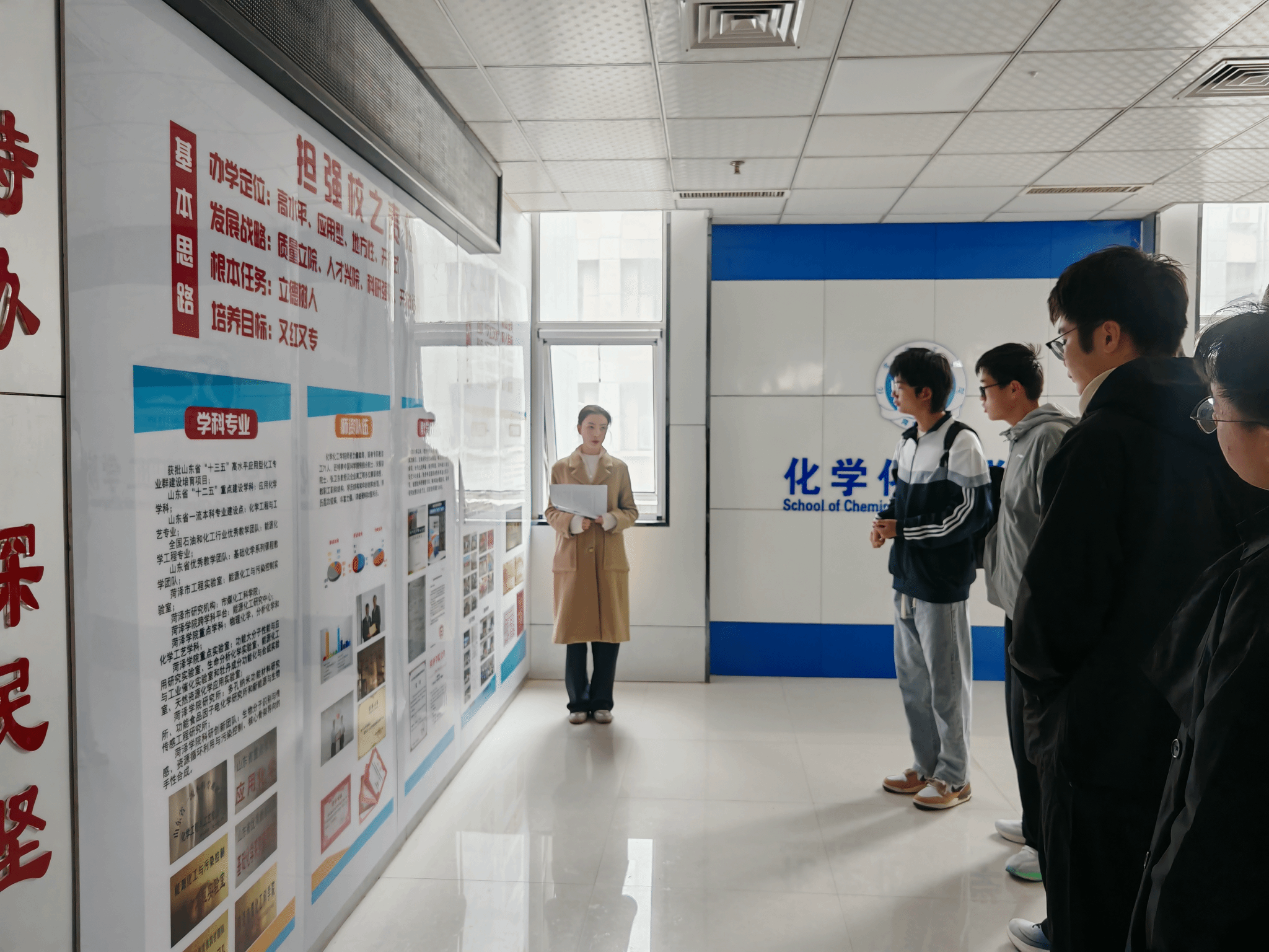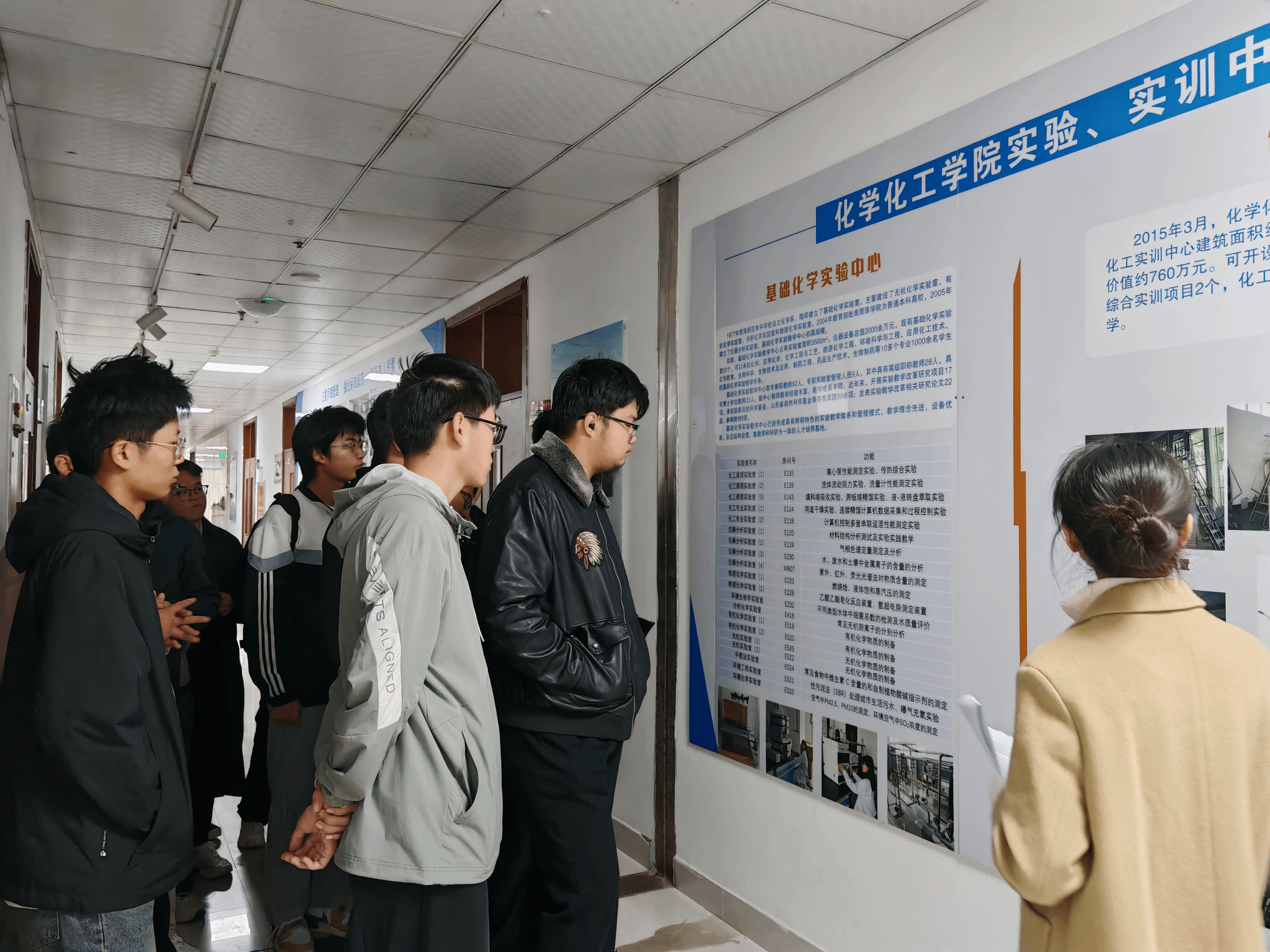 一踏入实验楼大门,宽敞明亮的大厅瞬间抓住视线——墙上的科学家画像与化学元素周期表交相辉映,一边诉说着化学史的辉煌,一边昭示着未来的无限可能。漫步走廊,两侧的科普展板更是“知识点满满”:从基础化学原理到前沿科研成果,每一块展板都是一扇小窗,让新生们在行走间就能“解锁”化学世界的奇妙。