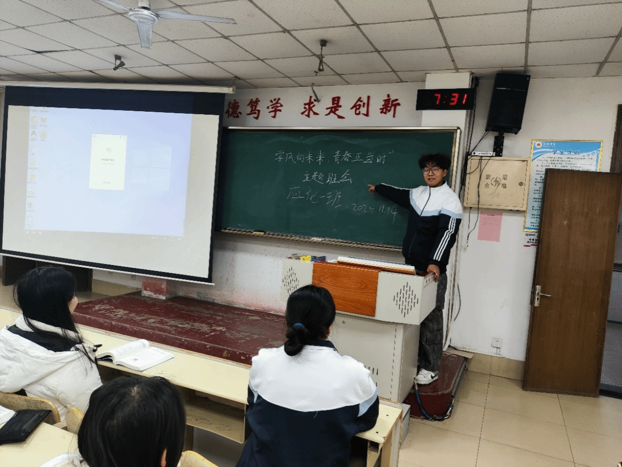 本次活动由班长靳军杰同学主讲,他以“时代浪潮奔涌,复兴征程催征”为核心展开分享。靳军杰谈到,党的二十大以来,“实干兴邦”成为新时代发展最鲜明的底色,青年作为国家建设的生力军,其青春担当与实干行动,是奏响时代奋进旋律的核心音符。在全面建设社会主义现代化国家的关键阶段,每一位青年都肩负着将理想落于现实、以实干托举使命的时代重任。