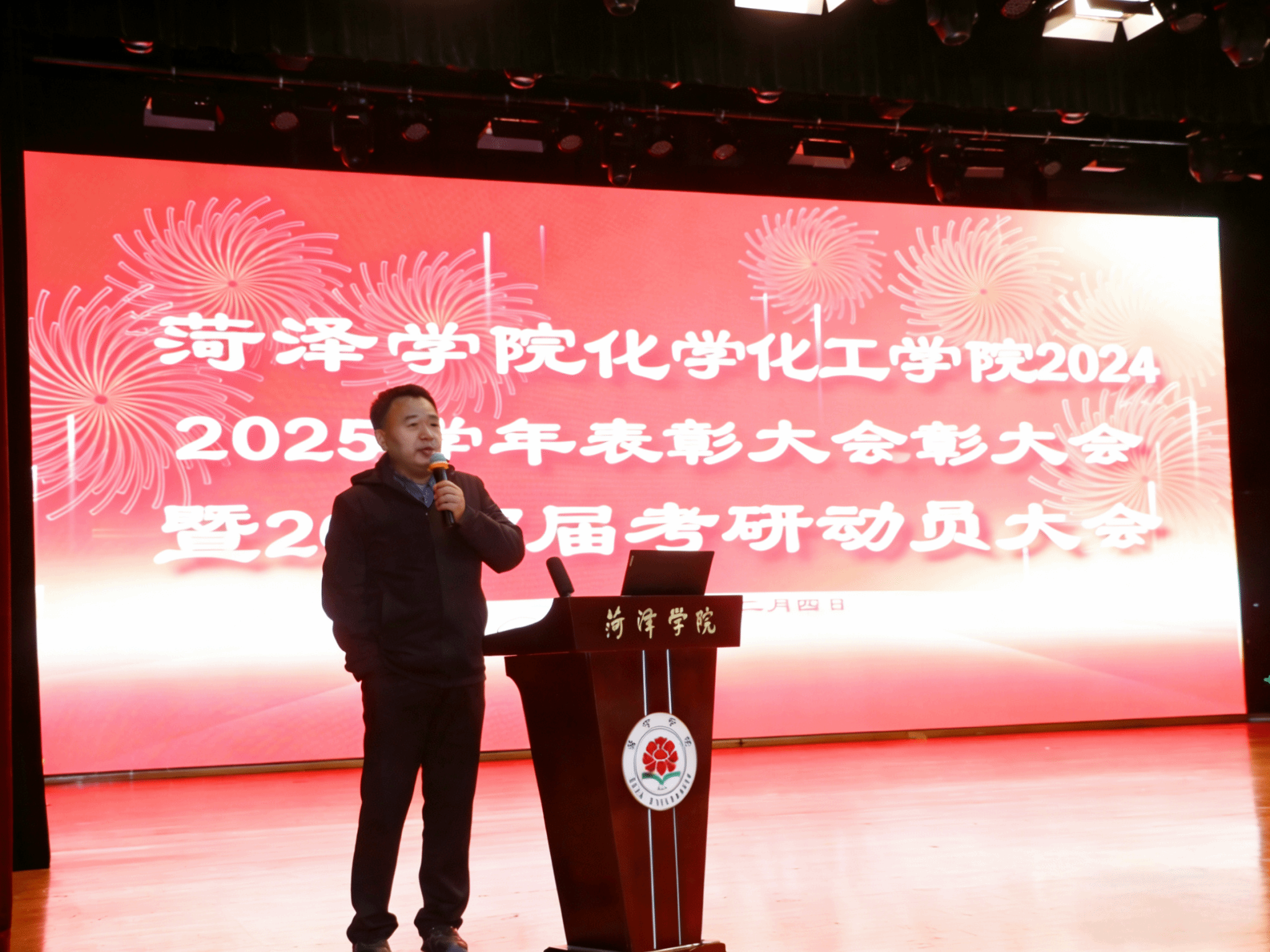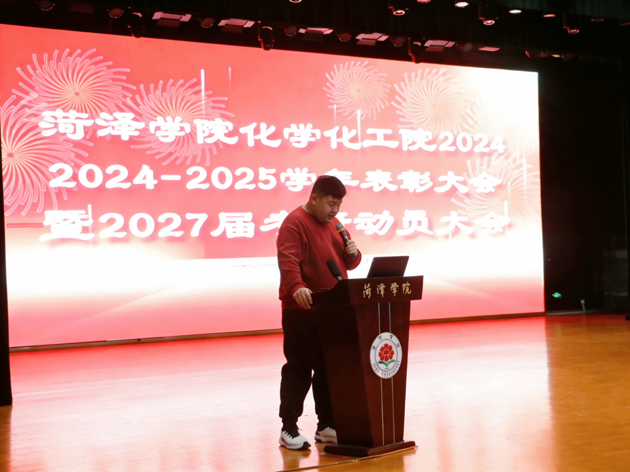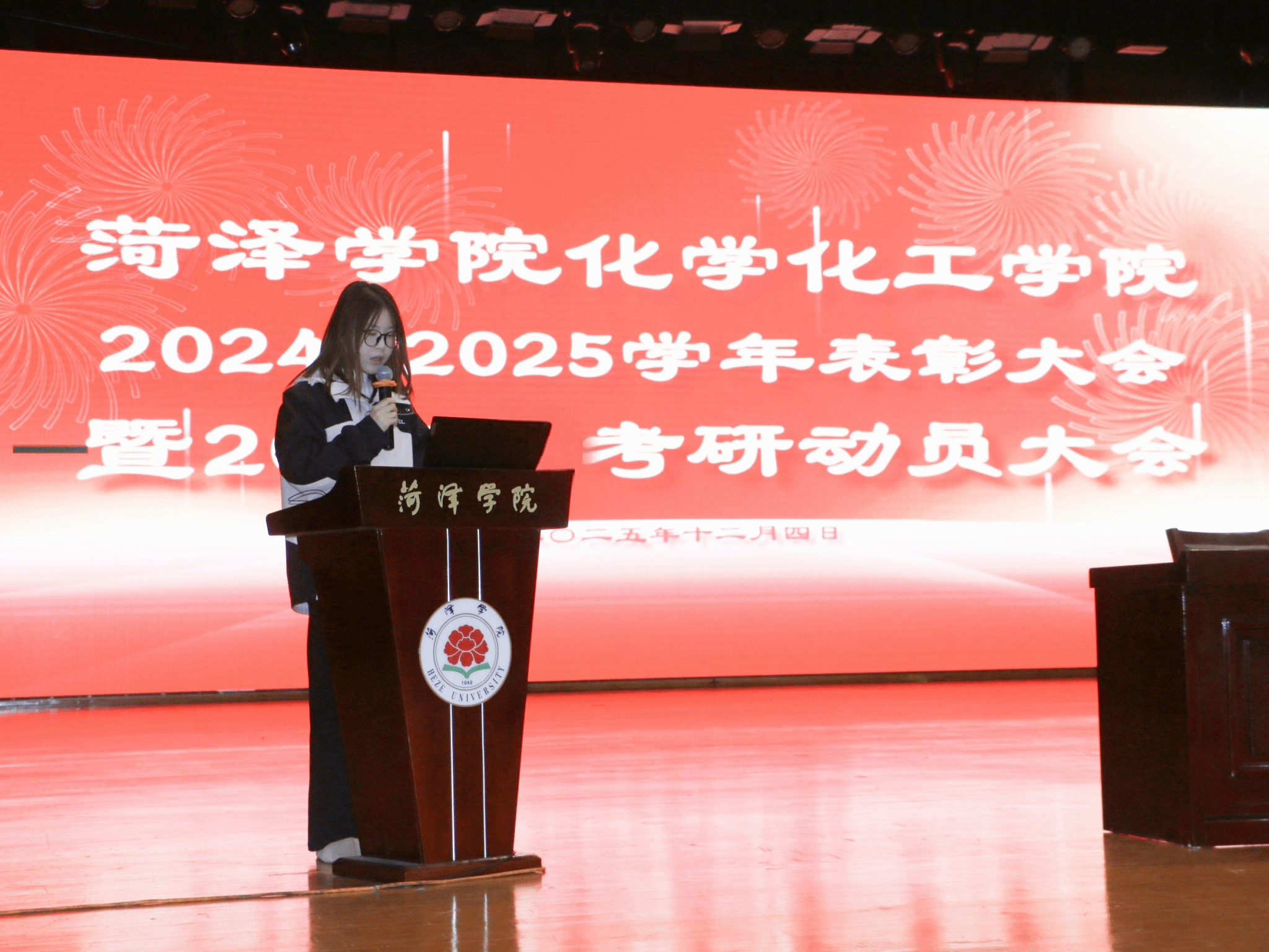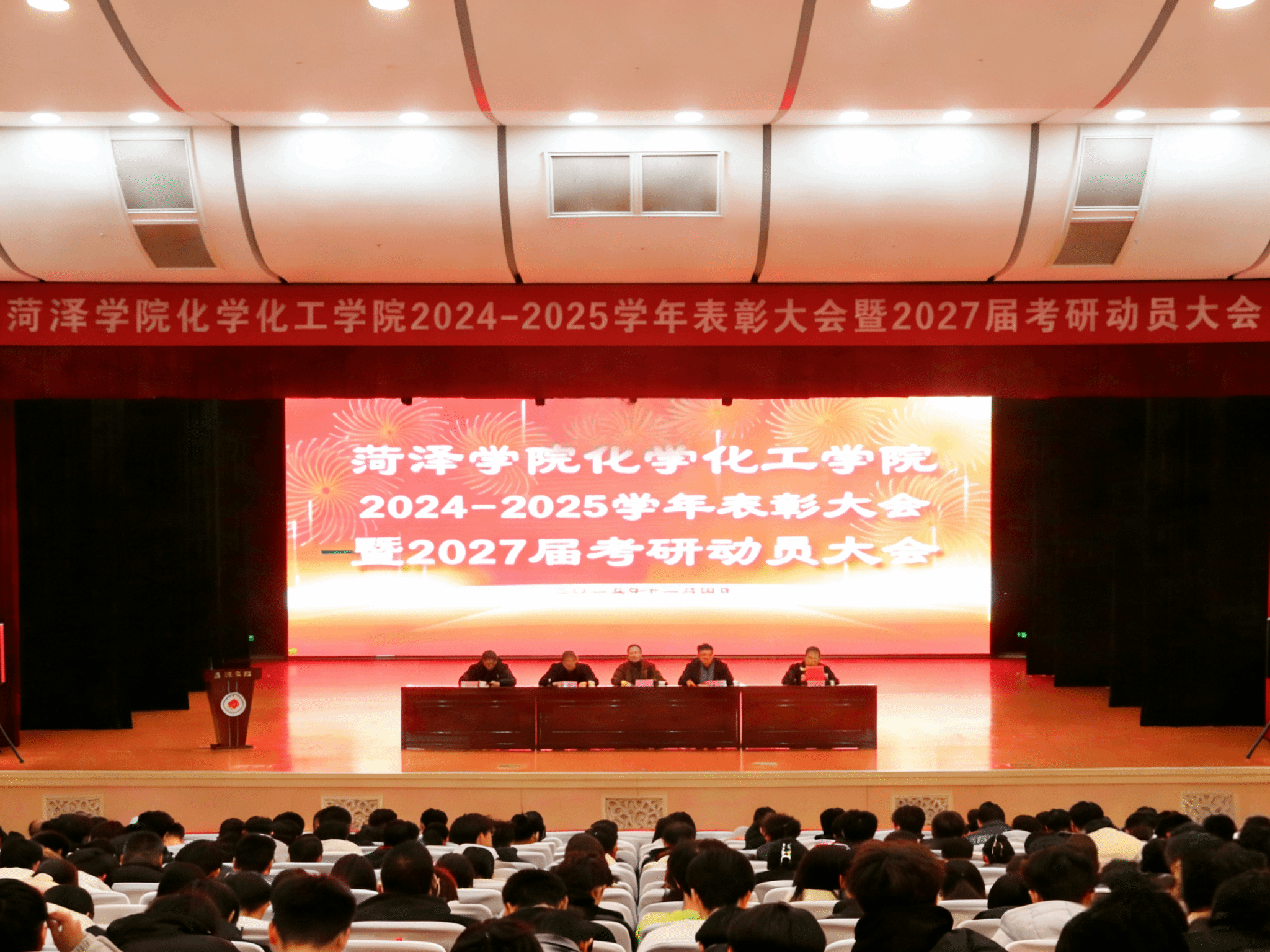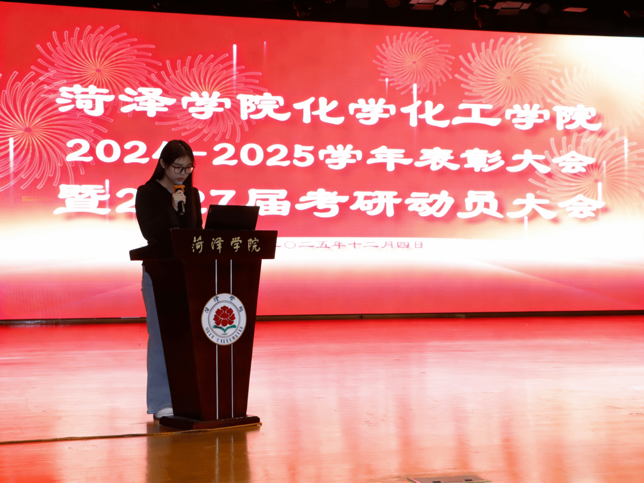 为表彰考研先进典型、发挥榜样示范引领作用,进一步激励2027届考研学子坚定备考信念、凝聚奋进力量,12月4日,化学化工学院于艺术演播中心隆重举办2024-2025学年表彰大会暨2027届考研动员大会。化学化工学院党委书记王化荣、院长李风海、党委副书记李建芳、副院长林枫与卢胜杰出席会议,班主任、辅导员,2024-2025学年先进个人代表,先进集体代表及2027届考研学子代表共同参会。本次大会由党委副书记李建芳主持。