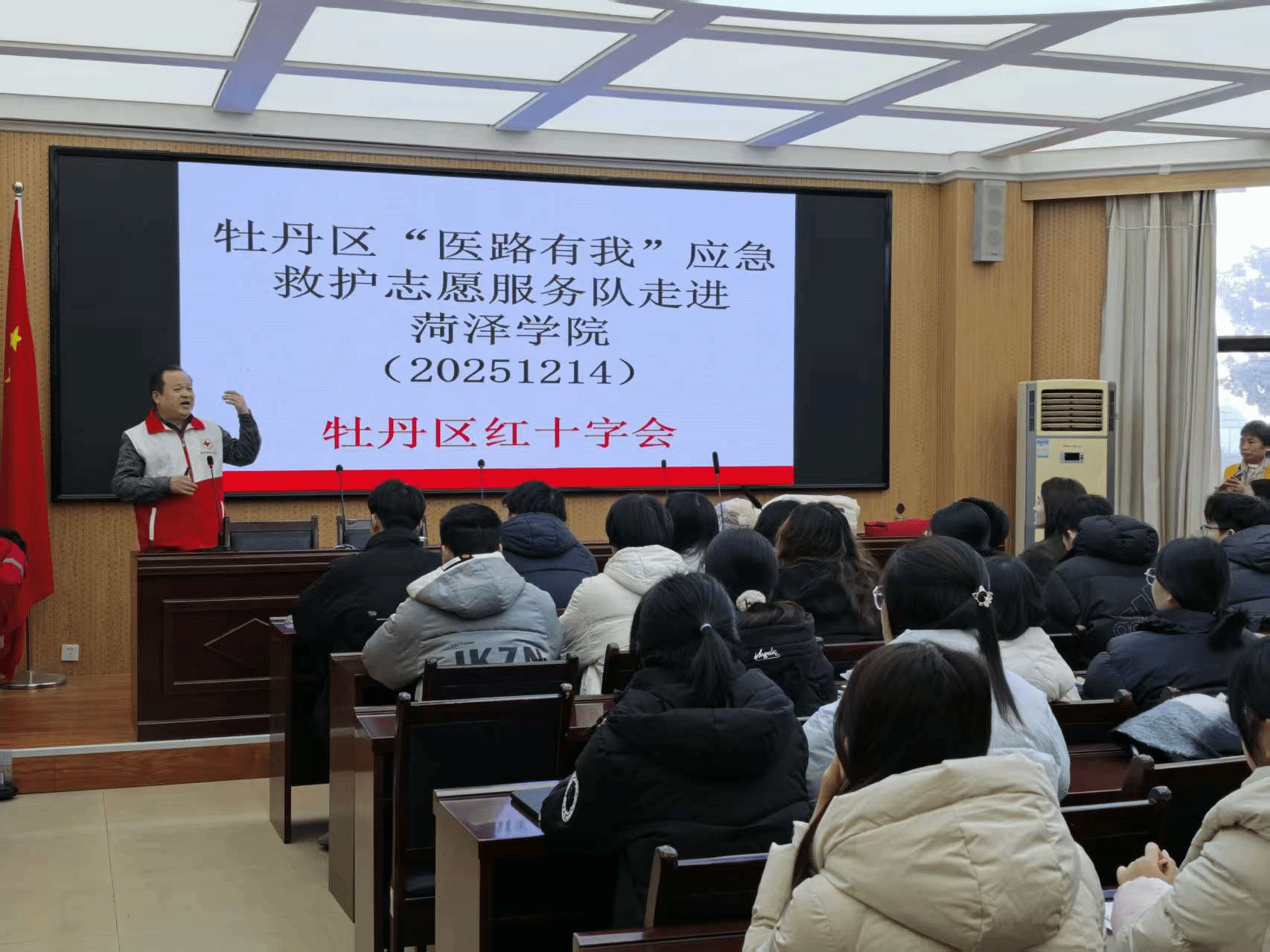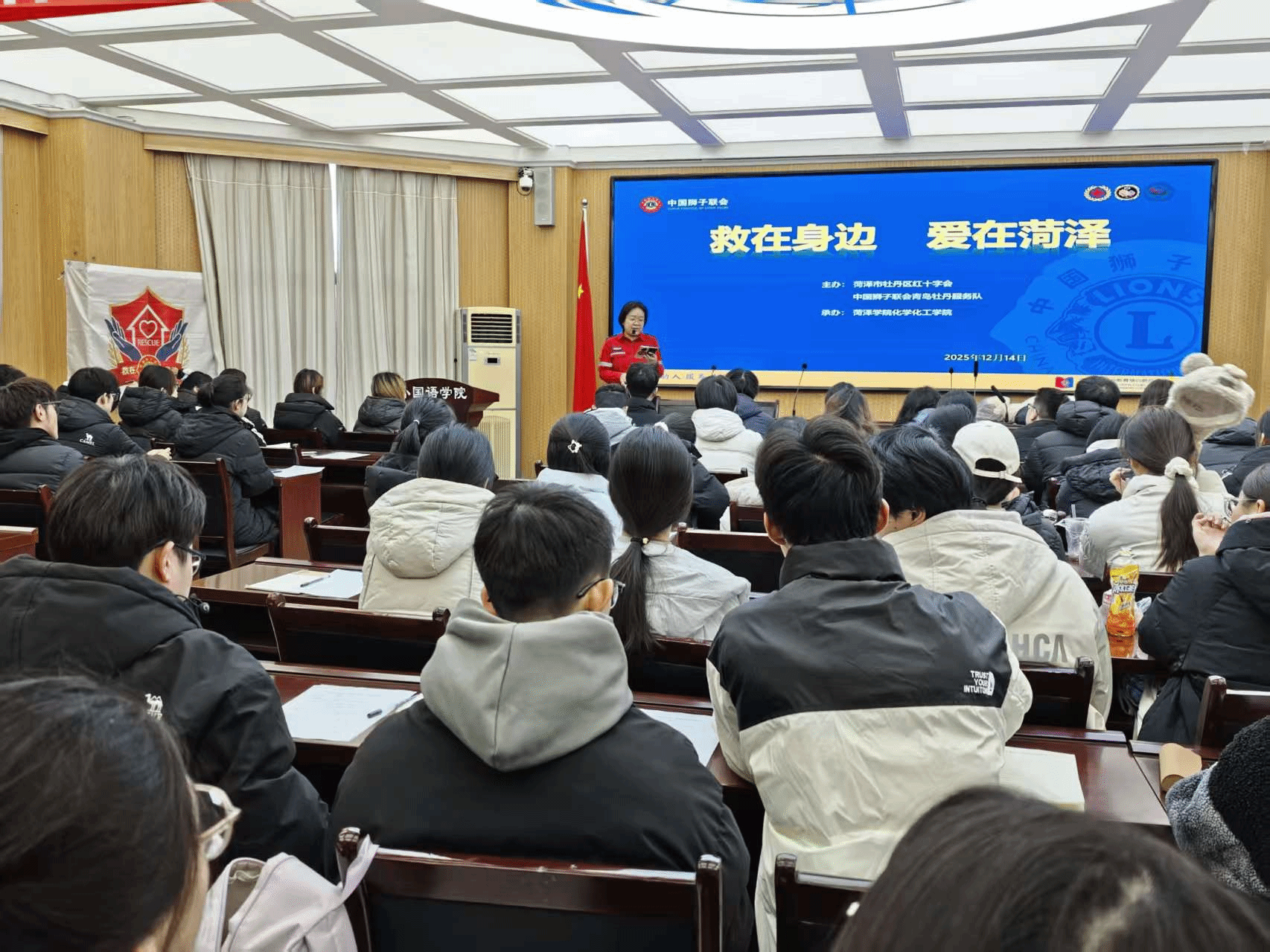 为提升师生应对突发意外事件的自救互救能力,普及院前急救知识,12月14日,菏泽学院化学化工学院联合菏泽市牡丹区红十字会、中狮联牡丹服务队,于外语楼102会议室举办院前应急救援专题培训。化学化工学院学工办主任高靖、辅导员周脉杰及学院约100名师生代表共同参与此次培训。