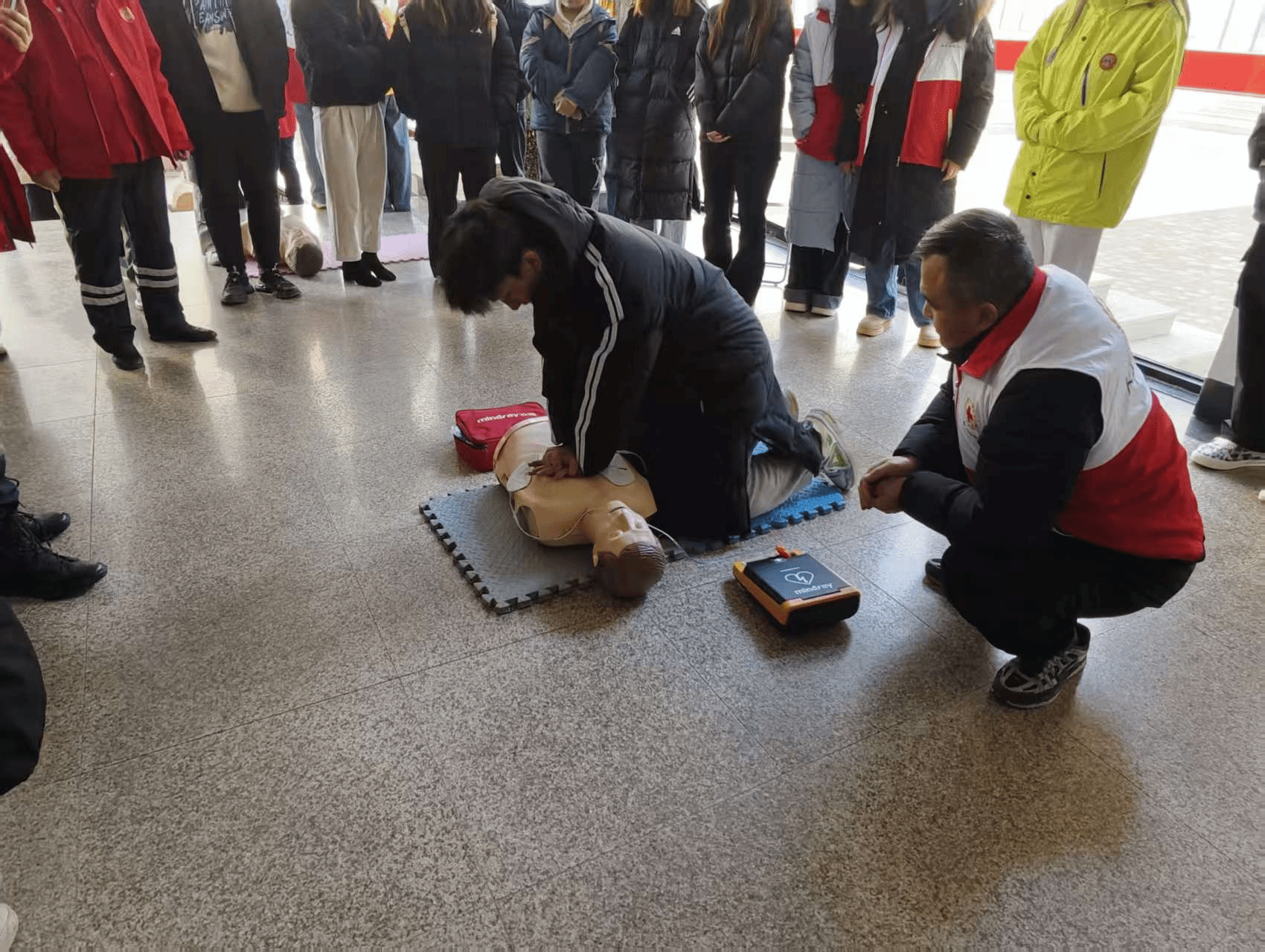 培训现场,红十字会的专业讲师结合校园生活与突发场景,从理论层面系统讲解了心肺复苏(CPR)、气道异物梗阻急救、创伤止血包扎等核心急救知识,通过典型案例剖析急救黄金时间的重要性,让参训师生清晰认识到掌握基础急救技能的必要性。中狮连牡丹服务队的志愿者则聚焦实操环节进行手把手教学,借助模拟人教具演示心肺复苏的标准流程——从判断意识、胸外按压的深度与频率,到规范实施人工呼吸;同时示范了三角巾包扎、止血带使用等创伤急救操作,逐一纠正师生在实操中的不规范动作,确保大家熟练掌握操作要领。培训最后,全体参训师生依次参与了心肺复苏、创伤包扎、气道异物梗阻急救等技能的考核,评委依据专业标准严格评分,全员通过考核,展现了扎实的学习成效。