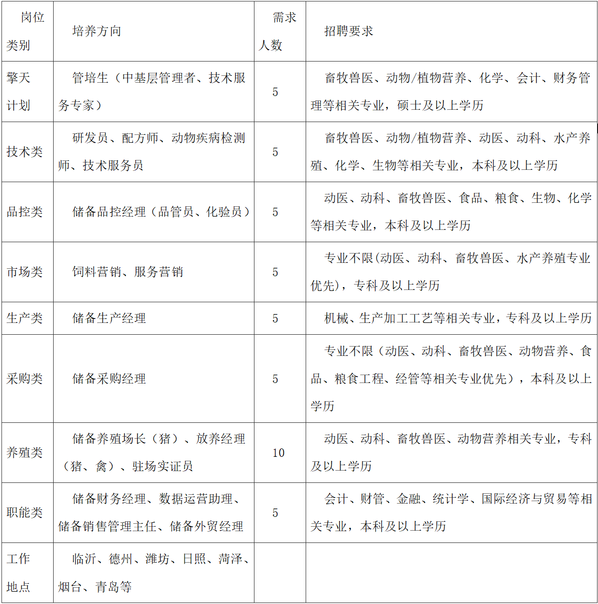 2、本科以上学历,食品、机械、电气、农业、生物、化学、畜牧、财务、统计等相关专业;