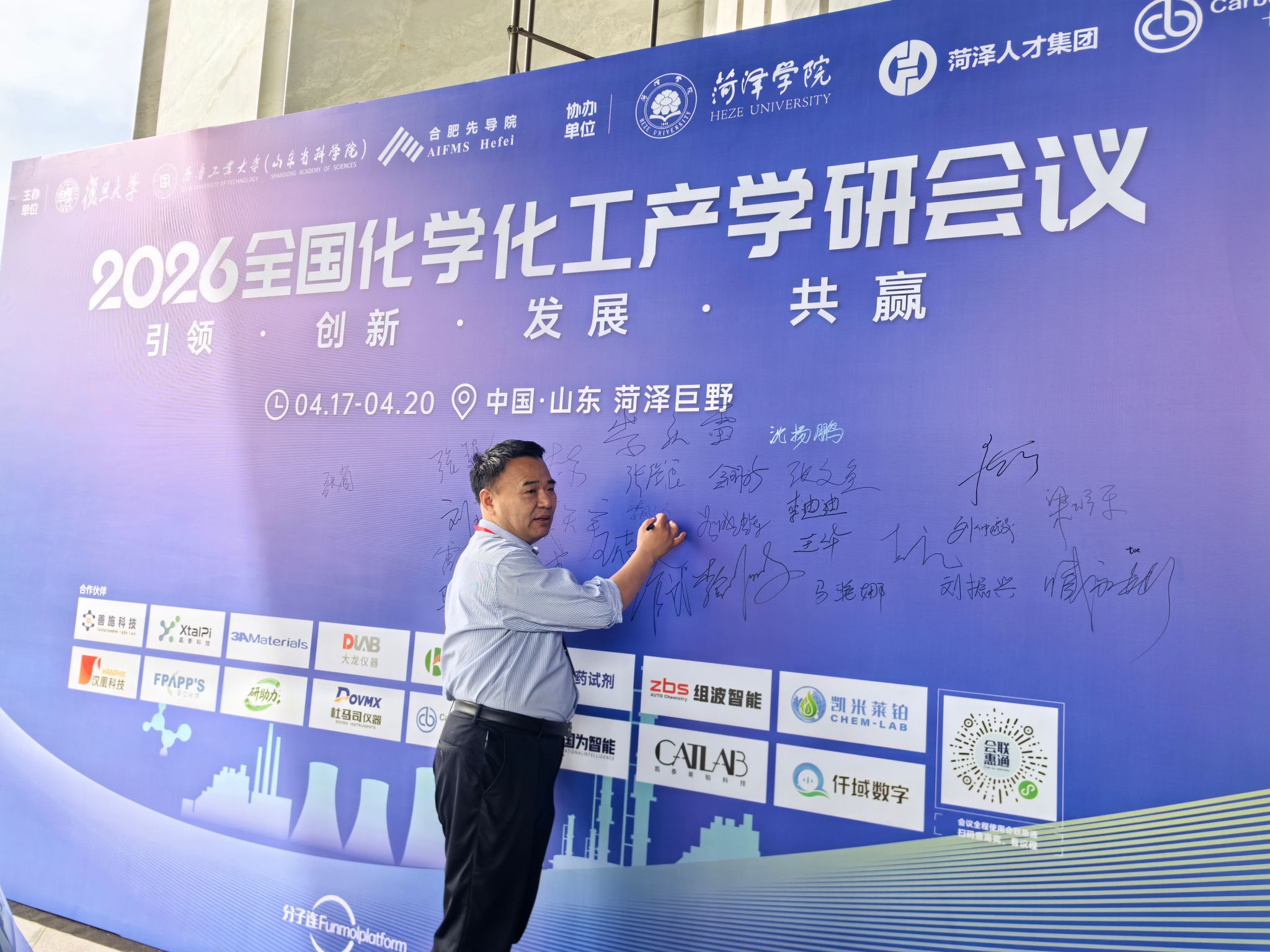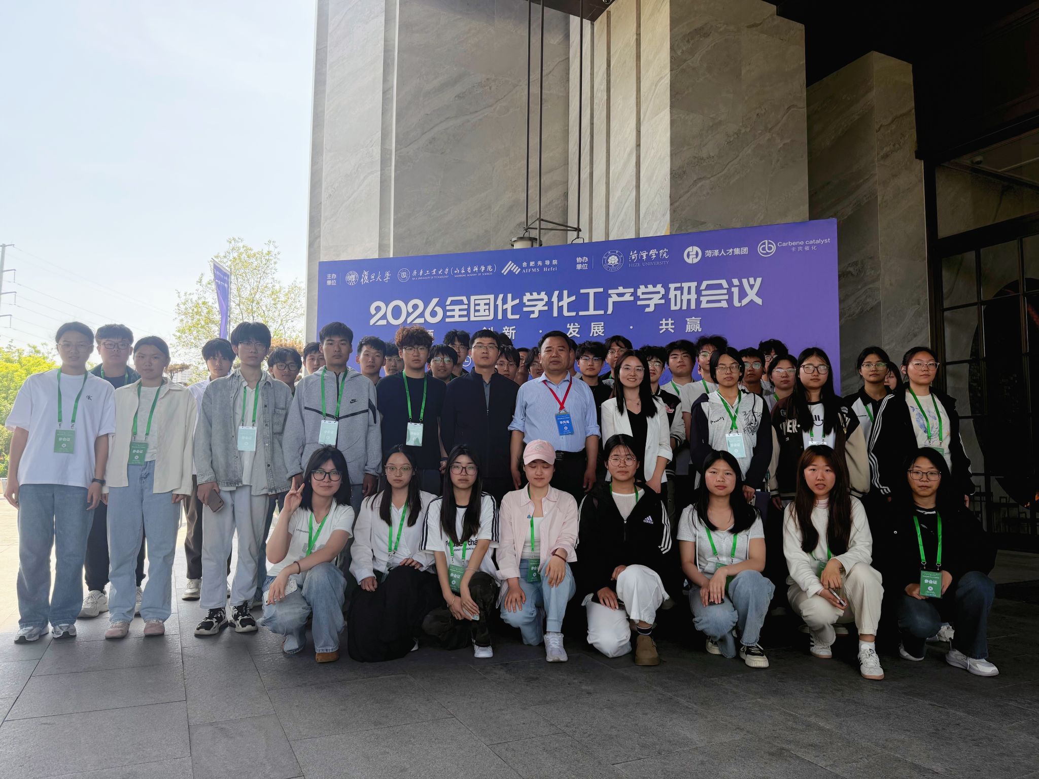 4月17日—4月20日,2026年全国化学化工产学研会议在山东菏泽巨野成功举办。本次会议以“新质生产力引领化学化工高质量发展”为主题,汇聚包括2名院士、30余位国家杰青、长江学者等在内的全国500余名顶尖专家、科研学者与产业代表,共话前沿技术、共商产学研融合、共谋产业发展。我校作为协办单位之一,学校党委委员、副校长田智祥,化学化工学院党委书记杨冬,党委副书记、院长李风海参加会议。化学化工学院组织师生代表全程参会学习交流。