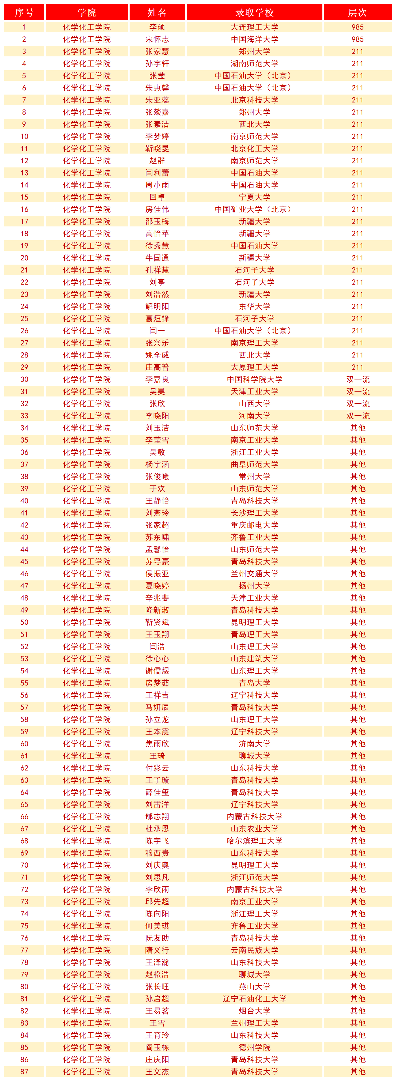2026年全国硕士研究生招生录取工作落下帷幕,化学化工学院2026年考研升学再创佳绩。全院共有87名学子成功上岸,较去年大幅增加25人,考研上岸率34.9%;其中27人考入211院校、2人圆梦985院校、4人被双一流高校录取,优质上岸率37.9%,上岸人数、升学质量同步攀升。