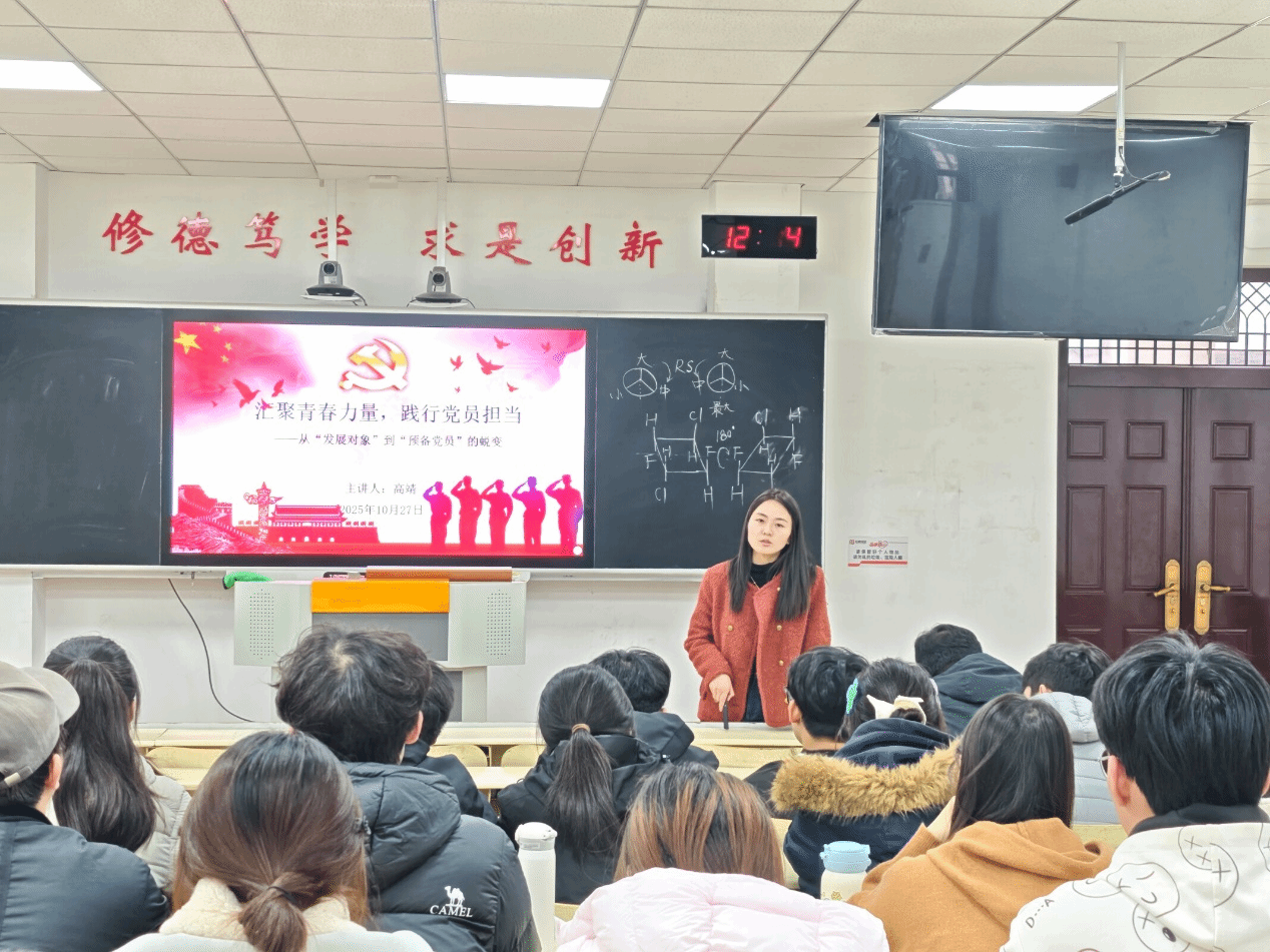 为了提升党员发展对象对党的认识,坚定其理想信念,10月27日,化学化工学院在9号楼112教室组织开展党员发展对象专题培训,学工办主任高靖担任此次培训的主讲人,全体2025年党员发展对象参与培训。