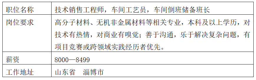 2.专业要求:车间倒班储备班长:材料、化工类专业车间工艺员、技术销售工程师:高分子材料、无机非金属材料。