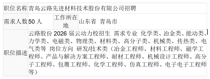 2、招聘专业:材料学 材料工程 材料物理与化学 海洋材料科学与工程。